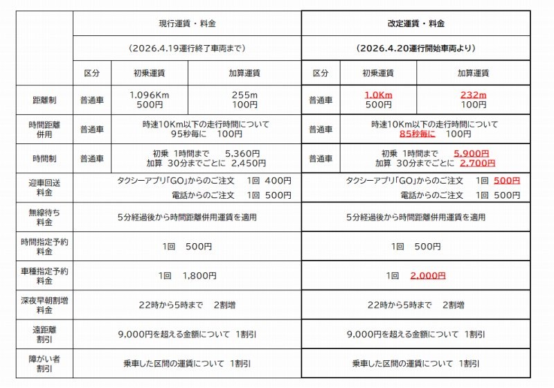 (改定運賃・料金は、2026年4月20日を運行日付として出庫する車両より適用されます。)